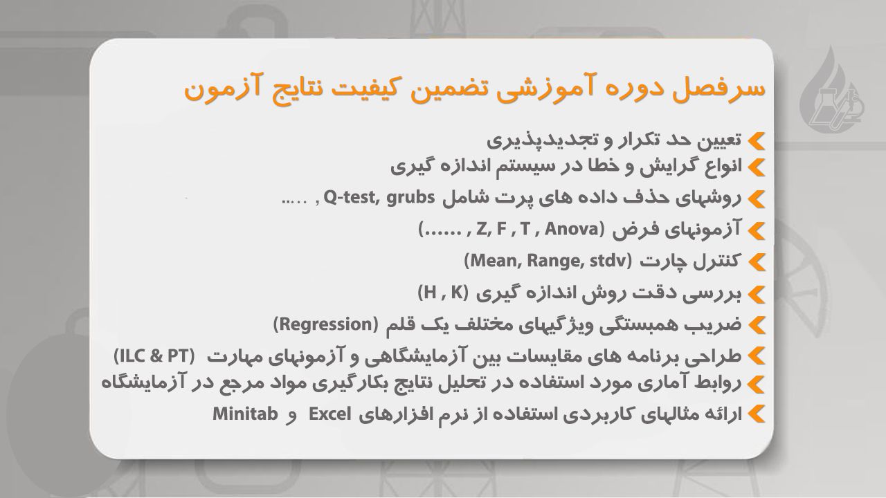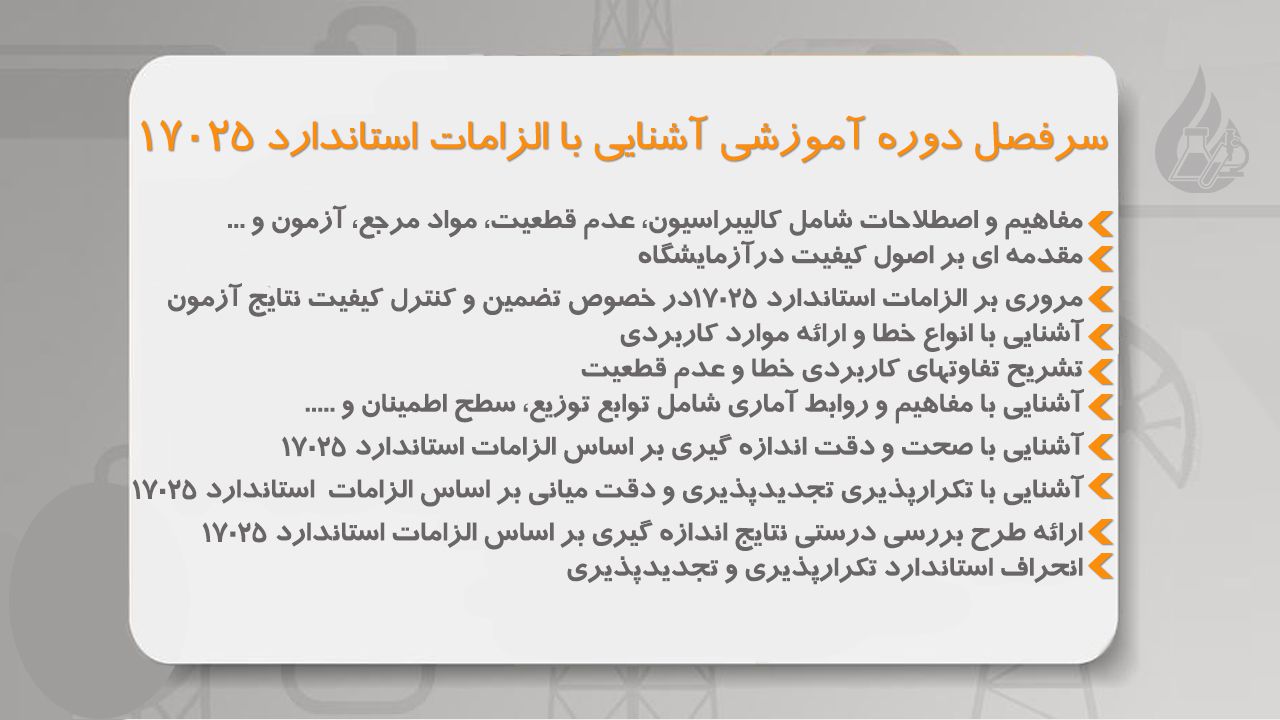 • دوره آموزشی اشنایی با الزامات استاندارد 17025 و کروماتوگرافی گازی و تخمین عدم قطعیت بهار 1400 آزمایشگاه فراورده های نفتی پترو آزمای سیراف دارنده گواهینامه ISO/IEC 17025