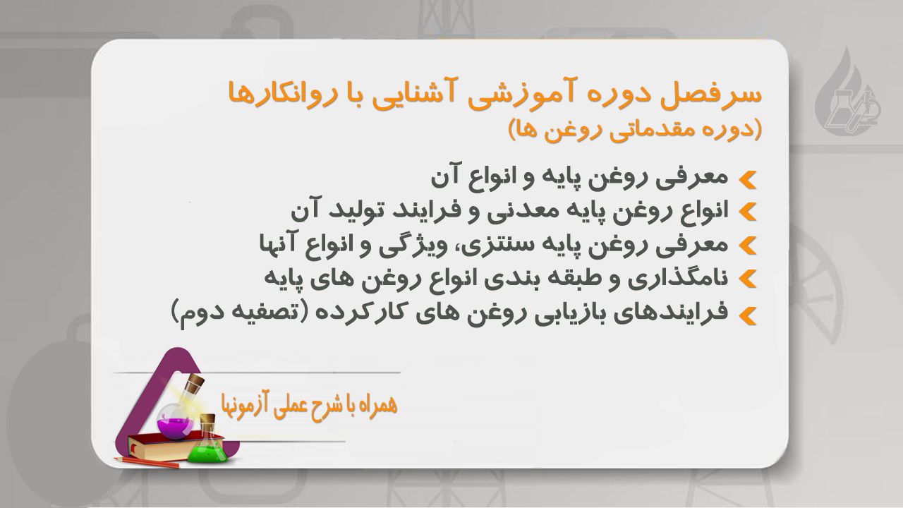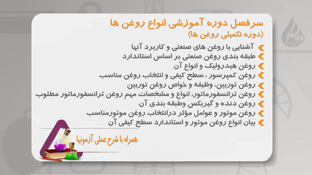 • دوره آموزشی روانکارها و انواع روغن صنعتی بهار 1400 آزمایشگاه فراورده های نفتی پترو آزمای سیراف دارنده گواهینامه ISO/IEC 17025