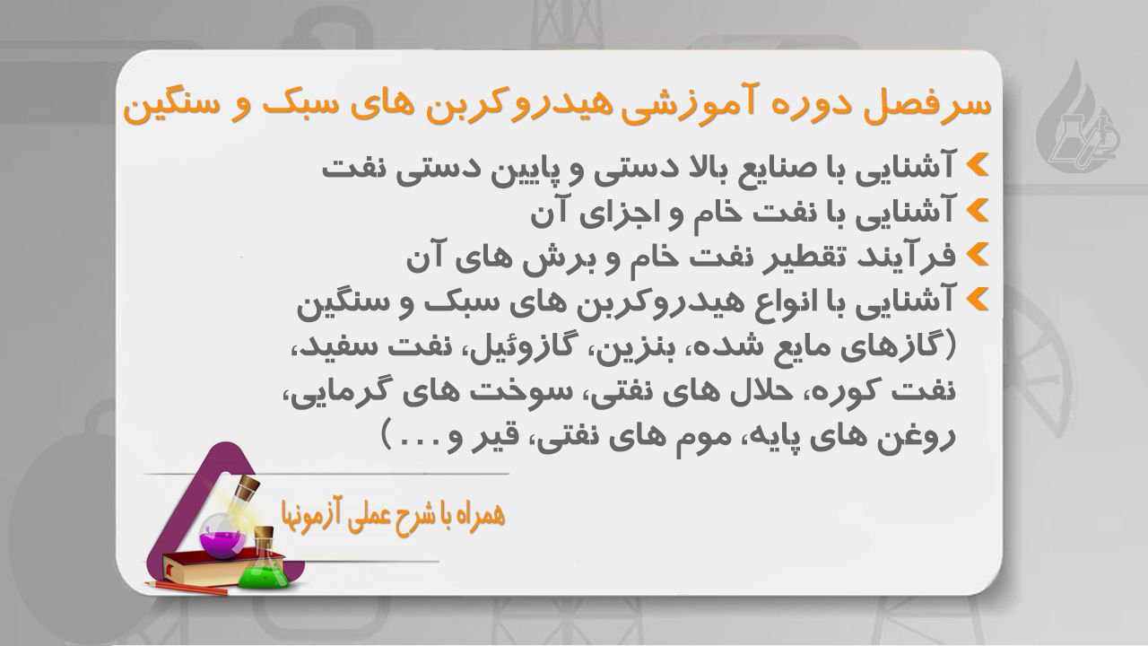 • دوره آموزشی  انواع روغن ها و آشنایی با هیدروکربن های سبک  و سنگین و تضمین کیفیت نتایج  بهار 1400 آزمایشگاه فراورده های نفتی پترو آزمای سیراف دارنده گواهینامه ISO/IEC 17025